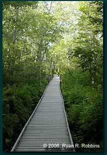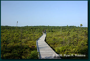 About a quarter of a mile from the beginning of East Trail, the 4,200-foot long Orono Bog Boardwalk enables visitors to City Forest to see a bog up close and personal without getting their feet wet. The boardwalk, a joint venture by the city of Bangor, the University of Maine, and the Orono Land Trust, has seen tens of thousands of visitors since opening in June 2003.