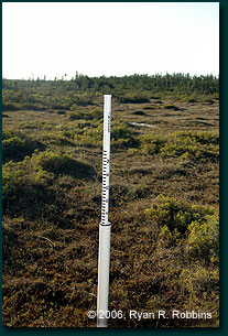 |  This measuring stick near the middle of the boardwalk's length shows how many inches of water are under the bog's surface.